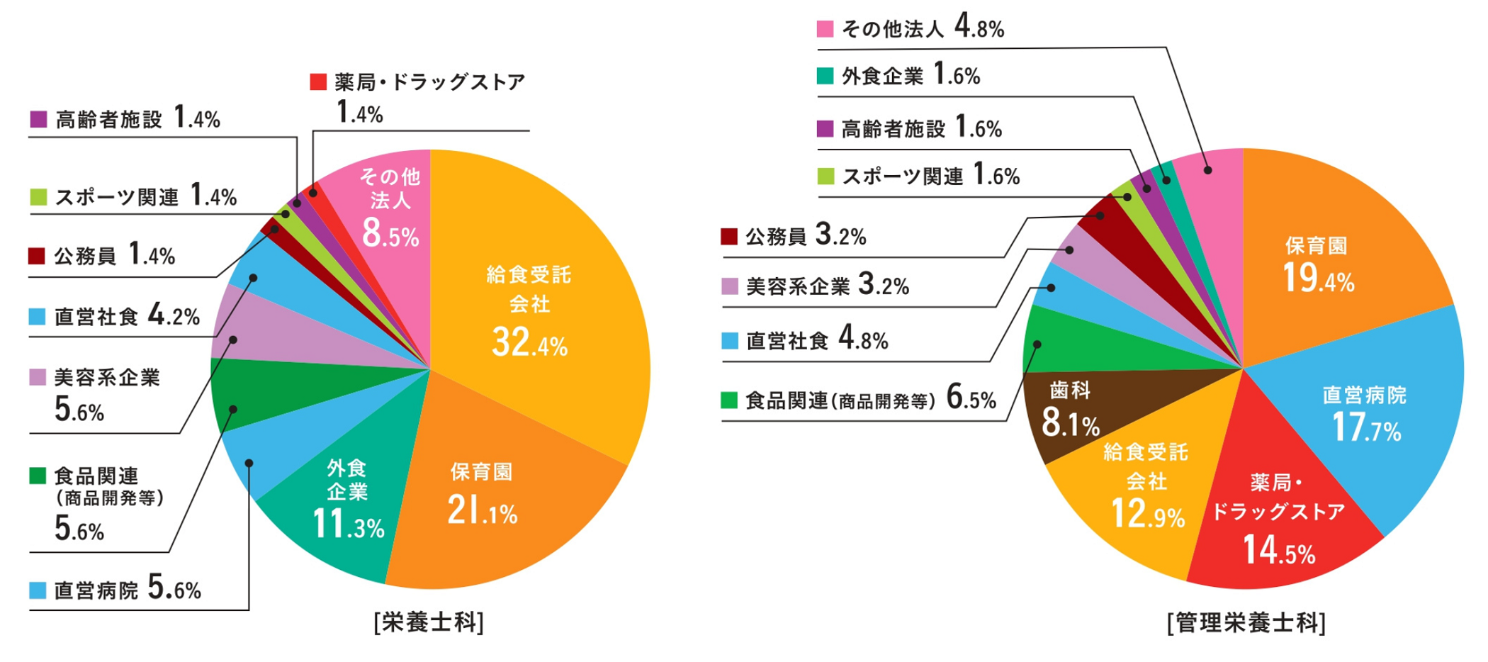 大学生などは、栄養士や管理栄養士の資格を取得しても資格とは関係のない一般企業に就職するケースが多くなっています。本校は資格を活かした就職先で実力を発揮できるようサポートしています。